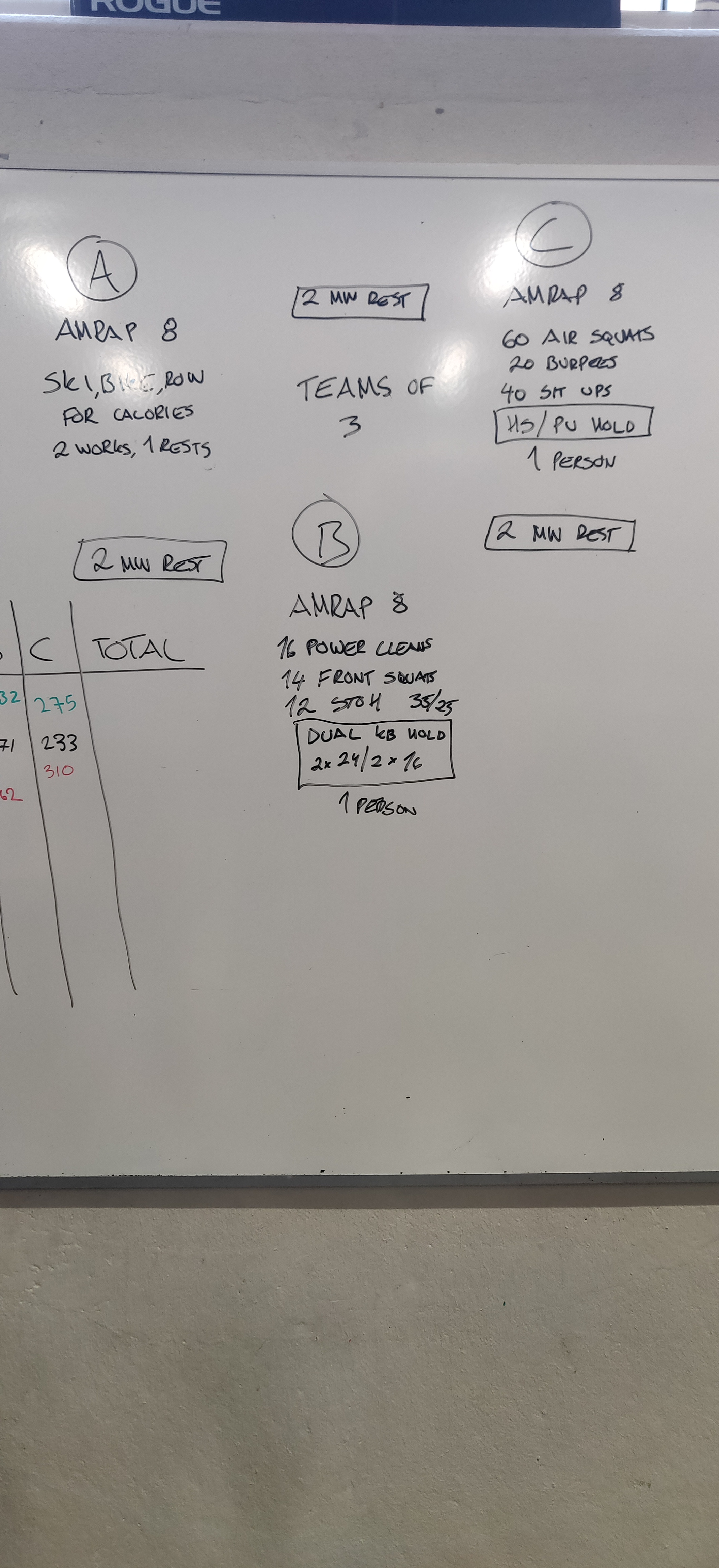 Score: total ammount of burpeesEli: ensin hiihto alta pois ja loppuaika niin monta bar over burpeeta kuin mahdollista. Burpeet tehdään ”bar facing” -tyylillä eli aina rintamasuunta levytankoa päin. Lastaa levytankoon isot kiekot.