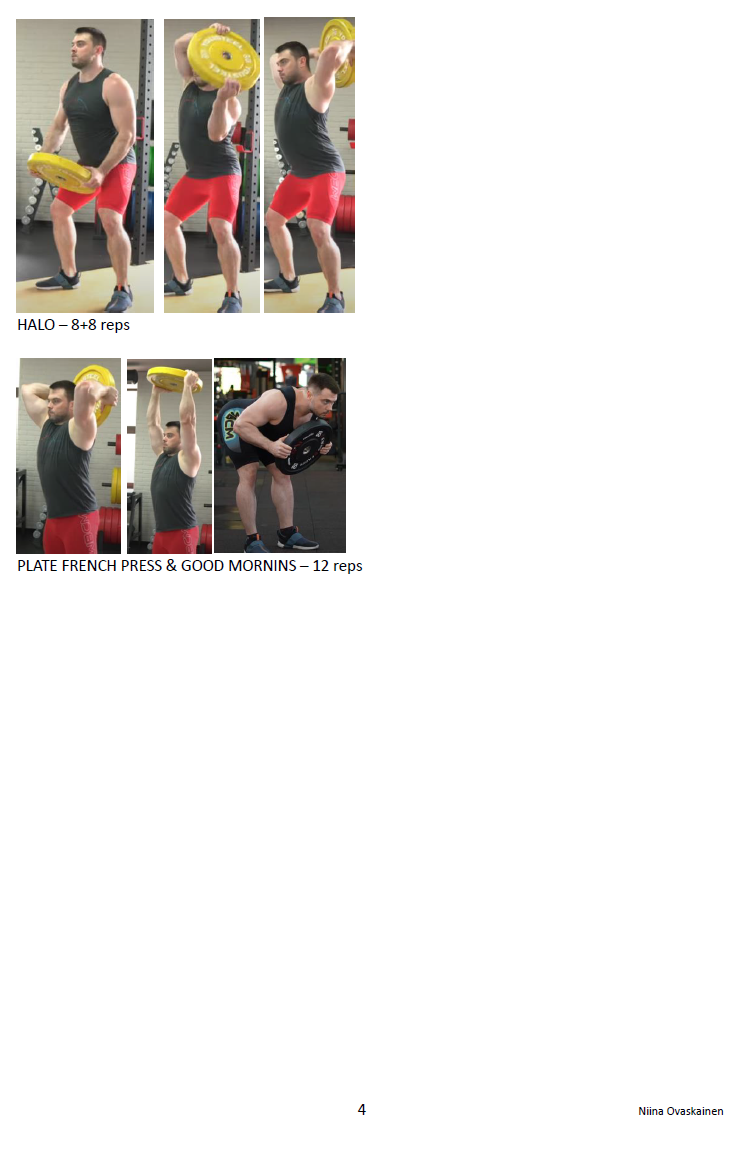 2× 3+3+3+3@barbell, 3× 3+3+3+3@light weight, rest btw sets 2min