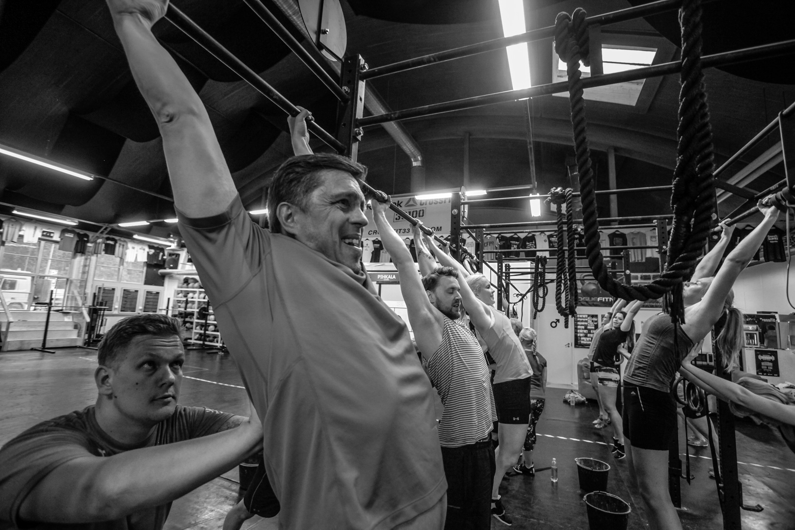 first you do 1 power snatch, then 1 PS and 2 OHS, then 3 BoB+2 OHS+1 PS, continuing adding one exercise per round.