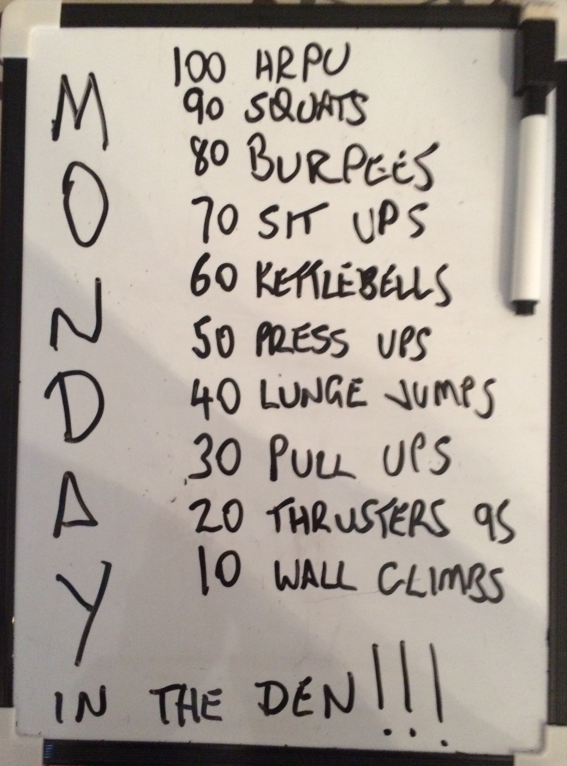 Evil Len in The Den today, 100 hrpu, 90 squats, 80 burpees, 70 sit ups, 60 kettlebell swings (1 pood), 50 push ups, 40 lunge jumps, 30 pull ups, 20 thrusters (95lb), 10 wall climbs. 34:24. Happy Monday😎