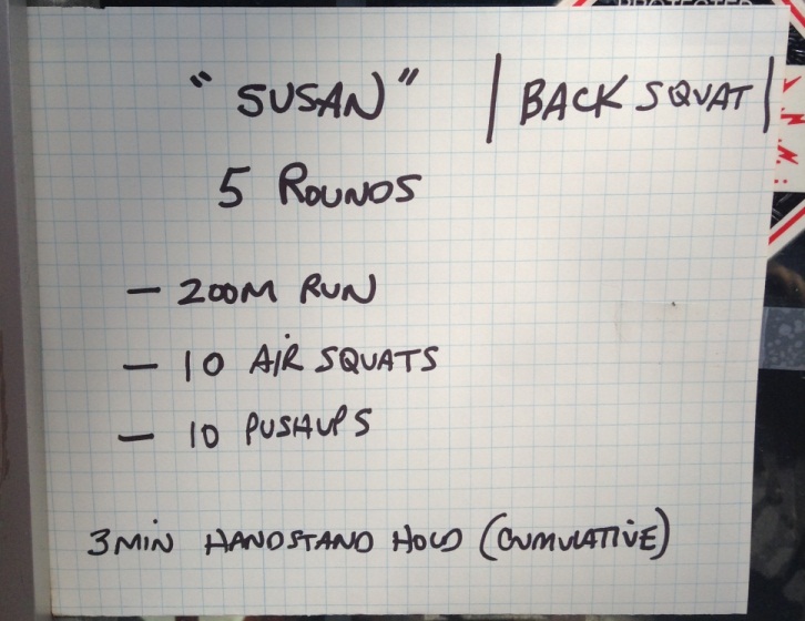 5 X 3 Front Squat (95#,115#,135#,135#,135# - failed on last rep)Worked half reps and negatives for HSPU. On the wall for all 5 rounds, so personal accomplishment for me.