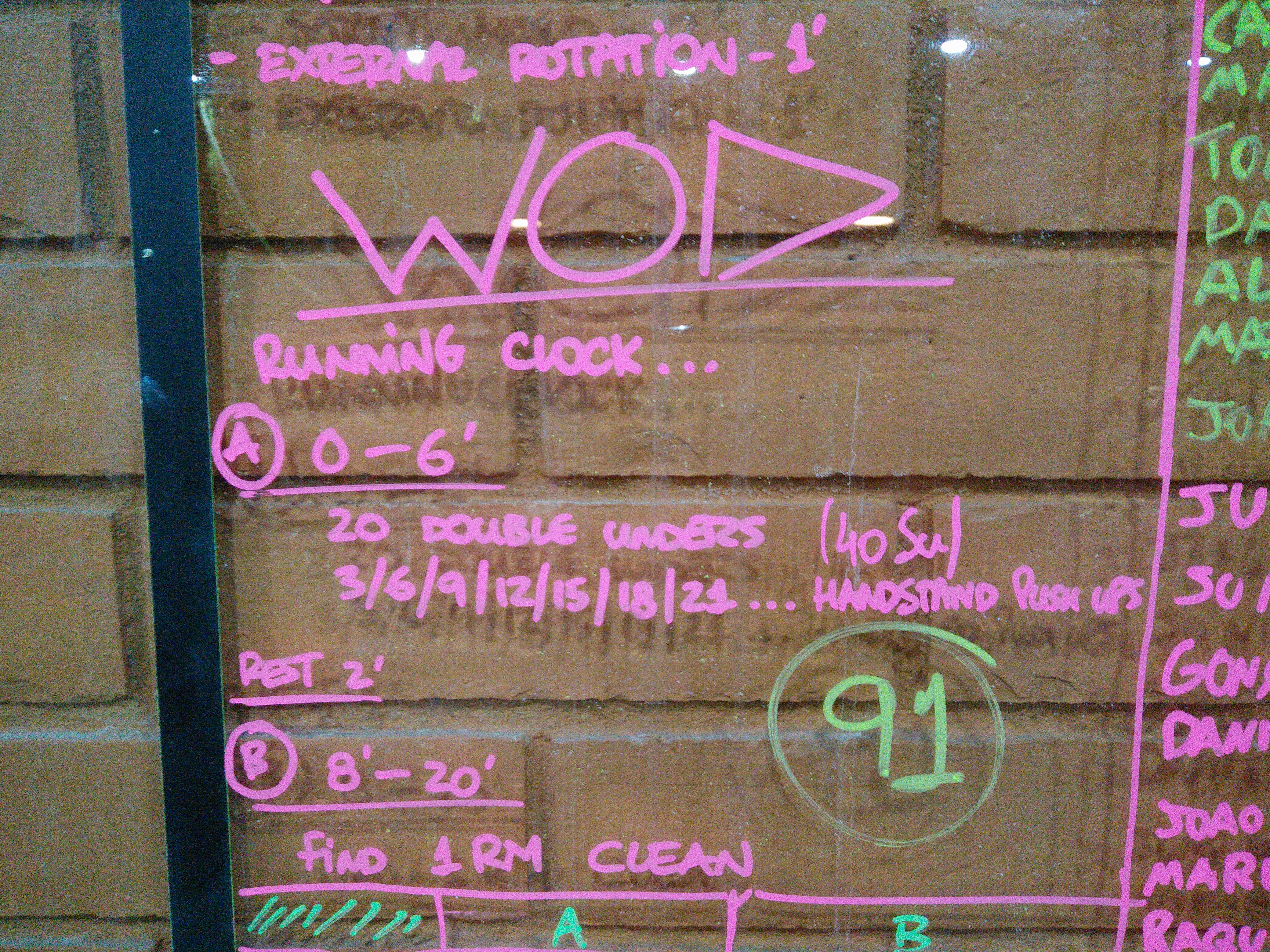 7 squat cleans, 185 / 135 lb.Stop at 20 minutes.
