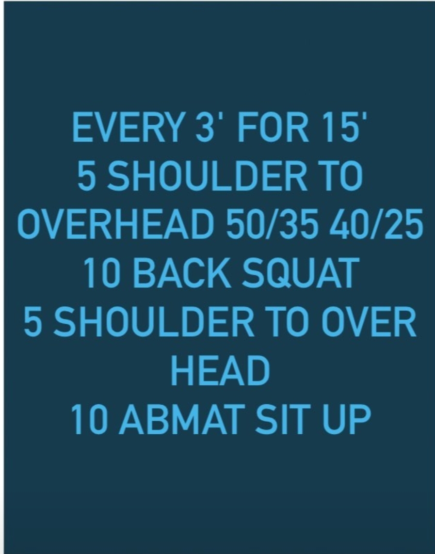 12 D-ball over shoulder 60/40kgStart with 1 Clean. Then do 2 Pistol squats and 1 Clean. The 3 Burpees, 2 Pistol squats and 1 Clean. Continue this way until the final round of 12 D-ball over shoulder, 11 Abmat sit-ups and each movement descending In repetitions all the way down to 1 Clean.
