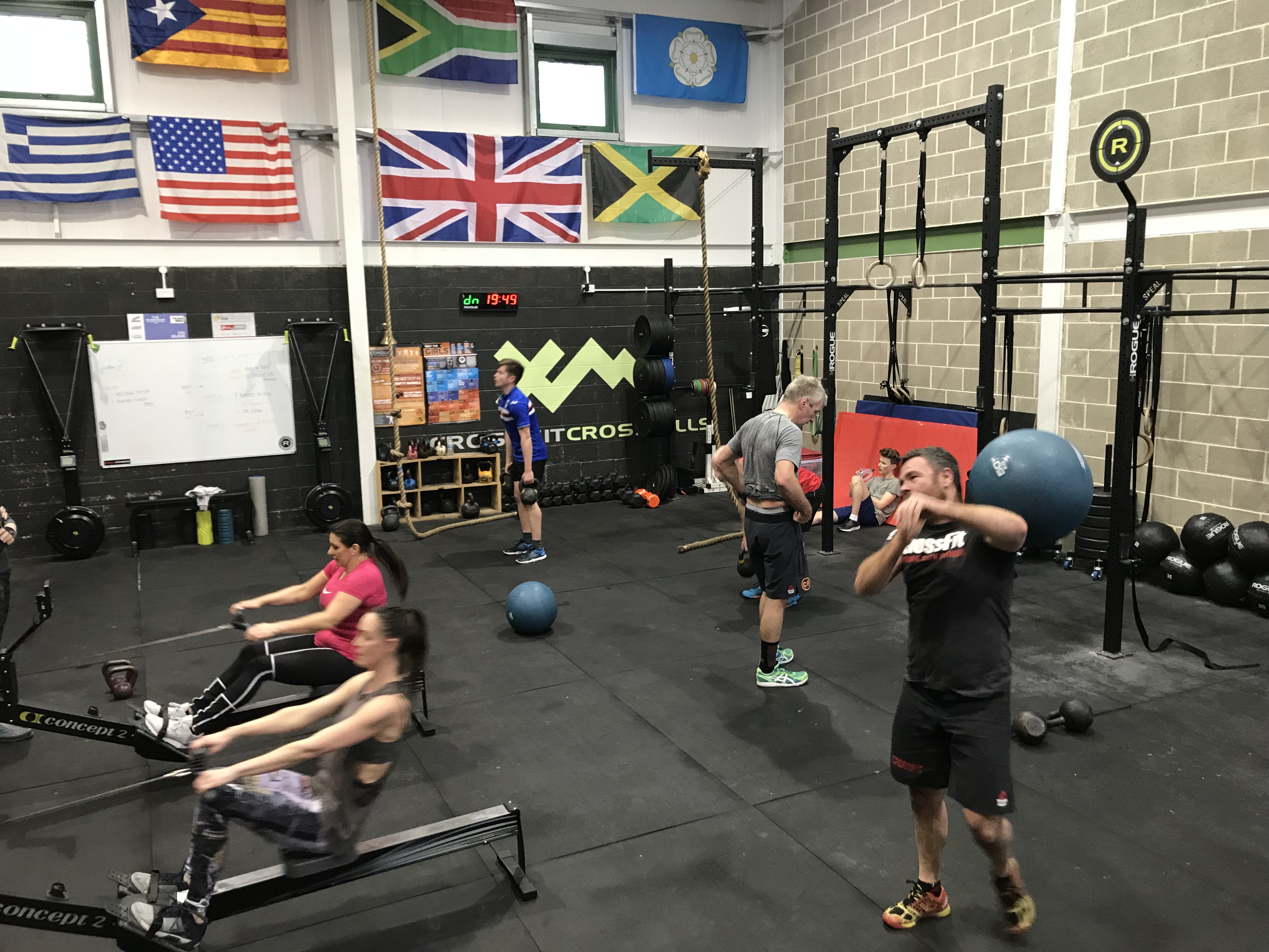 Reps: 7 rounds + 4 power cleanB. 16 DB snatch + 12 box jump overs > 35 lbs