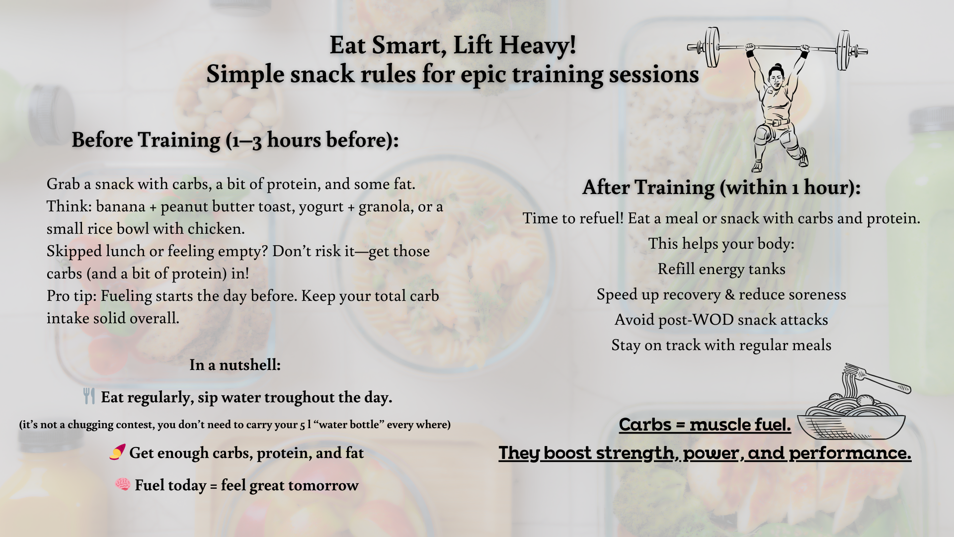 - Focus on strong body control and don’t rush your lifts. As you get closer to your 90% and up, make sure to do small additions to the weight instead of jumping 5-10kg at a time. This way you'll find an actual 3 RM.