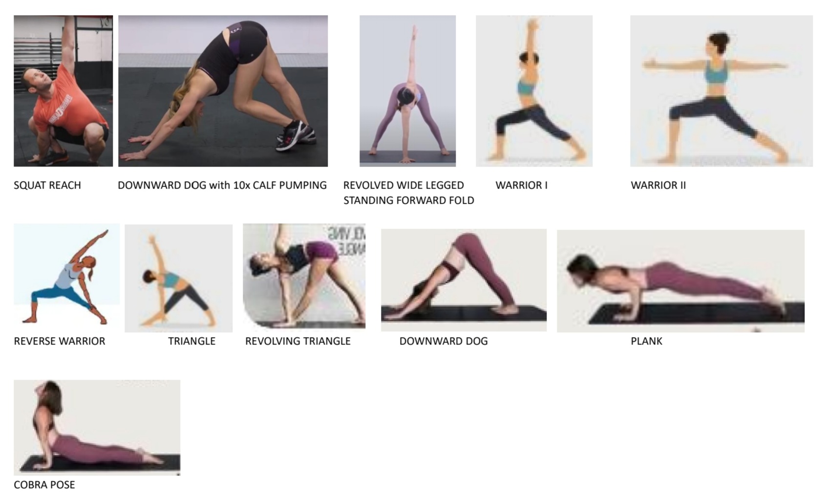 6x SQUAT REACH + DOWNWARD DOG with 10x CALF PUMPING + 6x REVOLVED WIDE LEGGED STANDING FORWARD FOLD + WARRIOR I + WARRIOR II + REVERSE WARRIOR + TRIANGLE + REVOLVING TRIANGLE +