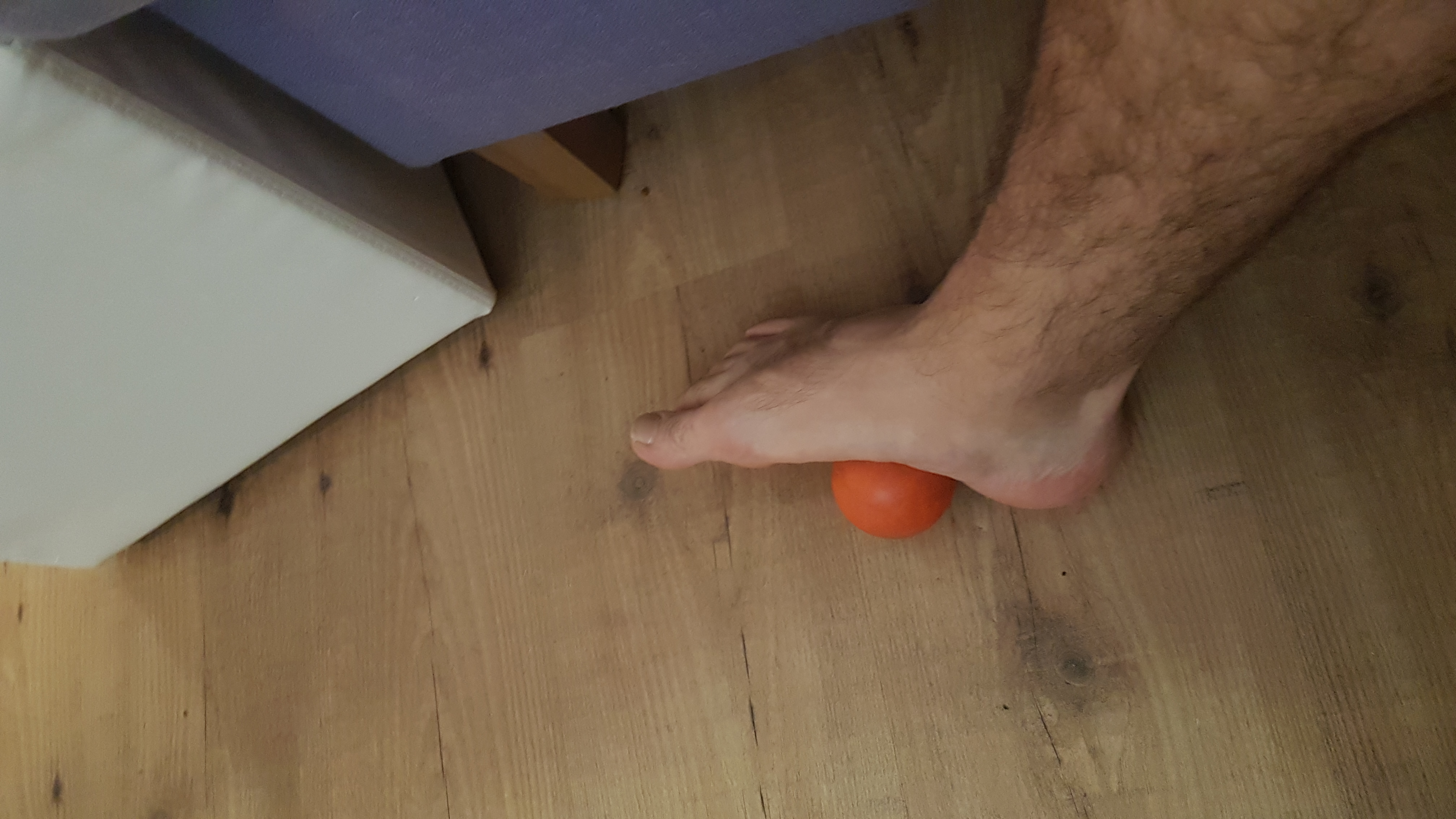 Käsittele kumpaakin jalkapohjaa huolella, noin 4 minuuttia per jalka. Pysähdy aina kipeään pisteeseen ja anna varovasti painetta. Välillä voit ikään kuin noukkia palloa jalkapohjallasi.